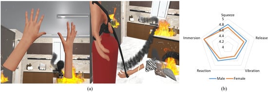 Training the use of a fire extinguisher using the haptic glove: (a) VR application and (b) radar chart (force feedback for squeezing and releasing the handle, nozzle vibration and reaction, and VR immersion) surveyed from user experiences.