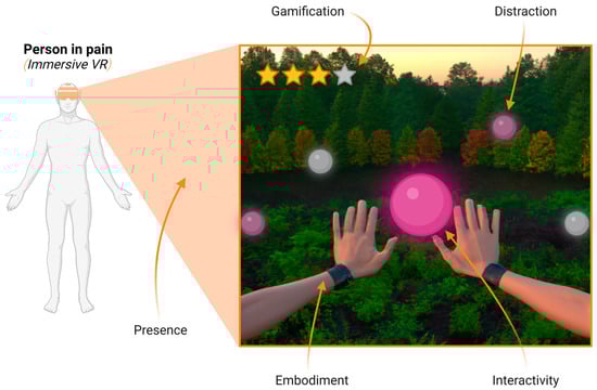Likewise, hypoalgesic effects of immersive VR have been associated with two general categories that are related to the type of experience modality: short-term distraction and long-term neuroplasticity [17]. The most investigated experience modality in VR is distraction (78.6%) followed by virtual embodiment (17.1%). However, although distraction is the mechanism used in 97.8% of acute or experimental pain studies, virtual embodiment was more commonly used in chronic pain conditions (54.5%) [23]. Indeed, it has been shown that the short-term hypoalgesic effects of distraction from pain had a lower impact on pain relief in chronic pain conditions [9]. However, its long-term efficacy, particularly in chronic pain management, is still an important area for further research [34]. In this regard, some evidence had shown that the modalities and features in which the immersive VR experience is induced might have an influence on the magnitude of the outcomes obtained for a pain decrease, as well as on the responsiveness to the intervention between different clinical profiles suffering from chronic pain [28]. Indeed, some factors related to user experience such as presence, interactivity, gamification, and virtual embodiment have also been highlighted as being significant in the immersive VR experience in people suffering from pain conditions [35,36] (Table 1).