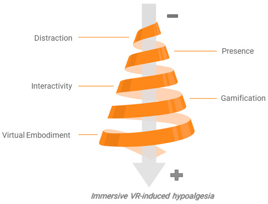 In the past few years, there has been significant advancement in effectiveness and hypoalgesic outcomes of VR technology in both acute and chronic pain [41,42]. However, the growing body of the literature in VR has not been accompanied by substantial advances in the understanding of how factors related to the user experience in VR impact on the hypoalgesic and clinical effects of immersive VR (Figure 1). For this purpose, this article aims to address the state of the art on the relationship between the experience-related factors embedded in immersive VR scenario and the magnitude of the hypoalgesic effect following the intervention.