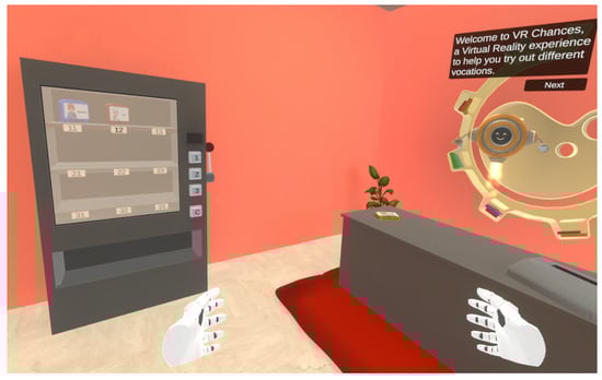 VRChances is an immersive and interactive job experience environment developed in collaboration with a local social service provider to address young adults from different social and cultural backgrounds. It is implemented in Unity (https://unity.com (accessed on 1 July 2024)), a widely used cross-platform game engine supporting the creation of 3D graphics, virtual reality, and simulations. Unity facilitates the import of assets and their assembly into virtual scenes and comes with an integrated physics engine that handles forces such as acceleration, collisions, and gravity. The application is designed as an extendable framework that provides different immersive and engaging tasks and hurdles a worker has to deal with in a certain job. The application provides teenagers and young adults with real-life scenarios without any associated risk due to its simulated nature, allowing them more freedom when working and experimenting. This allows users with optimal conditions to learn about various jobs in an engaging atmosphere. When starting the application, the player is located in a lobby room where a virtual guide welcomes the user and leads them through the experience. To enable interactions with certain tools and objects in VR, we used the package AutoHand (https://www.earnestrobot.net/unityassets/autohand (accessed on 1 July 2024)). It is a VR physics interaction system that supports Unity XR, SteamVR (https://www.steamvr.com/ (accessed on 1 July 2024)), and Oculus integration (https://developer.oculus.com/downloads/package/unity-integration/ (accessed on 1 July 2024)), allowing it to run standalone on Meta Quest or any devices supported by SteamVR. The package includes automatic pose generation, a movement controller, teleportation, and a collision guard system. Users can move freely within a predefined play area, enabling natural navigation within the virtual environment. To handle larger distances, users have to use the teleport system via the controller. The user presses a button on the controller to activate a colored laser beam that is pointed at the desired destination. Releasing the button then teleports the user to the selected location. The controller button mapping is displayed on a wall and explains how to move and interact with the environment. The different job scenarios are accessible as disks placed in a virtual vending machine from which the user can select the desired scenario by entering the respective number and pushing the handle on the machine. After inserting the disk into the slot of a virtual console, the user gets teleported to the selected job scene where the experience starts. Figure 1 shows the lobby room with the guide and the job disk vending machine. At the beginning of each job scenario, a robot guide assists the user and explains the different tasks to be completed. Each scenario is a designed educational experience that mimics scenarios in real-world job environments. These scenarios are structured to gradually introduce users to the complexities of a specific job role, starting with simpler tasks and progressing to more challenging ones. The experience starts with a clean-up quest in which the user has to pick up and sort relevant tools to perform the job tasks. Interactable objects in the scene are highlighted with a solid outline when a quest requires their usage. The outlines are visible from any point in the scene and are not obstructed by other objects. It should help players find their tools easily, especially in the initial phase. The guide explains the tools the player has to look out for and what quests to do, including multiple sub-quests that have to be solved. After completing the first beginner tasks, the user has to apply the newly gained knowledge. However, if the player gets lost, there is always the opportunity to interact with the guide to get hints and support. In the end, the player is given a final task and needs to complete it under certain conditions like time pressure or a slightly changed end goal.