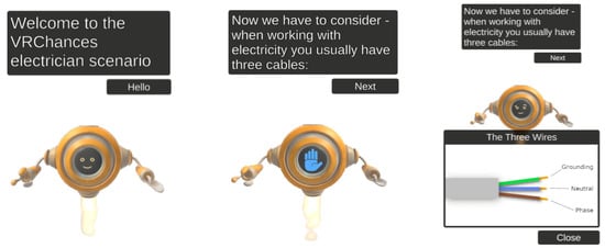A fundamental element of each job scenario is the guide interaction system. The system features a virtual robot that acts as an instructor guiding users through the virtual environment. The guide physically navigates to the position where the next task is to be performed, enhancing spatial awareness and providing clear direction. This capability ensures users are correctly oriented within the virtual space and know precisely where to focus their attention. The guide provides step-by-step instructions for completing specific tasks or activities and presents relevant information about the scenario, task, and tools. The guide interaction system includes a dialogue view and a hint view to display messages and additional instructions if needed. Figure 2 illustrates the interaction with the dialog and hint system. The blue hand symbol indicates an available hint and opens the hint view when the user touches it. Pressing the button next to the dialog box allows the user to navigate through the dialog. By delivering feedback, the guide helps users stay on track and prevents them from making common errors. The guide’s facial emotions change based on the user’s behavior, creating a more dynamic and engaging experience. If the user makes a mistake, the guide responds with a displeased emotion and provides further immediate feedback in a dialogue. Figure 3 displays all available emotional reactions that the guide can show in different situations (e.g., happy, angry, proud, and disappointed).