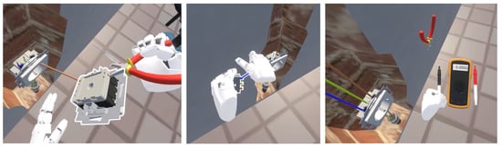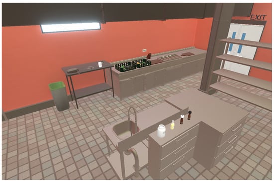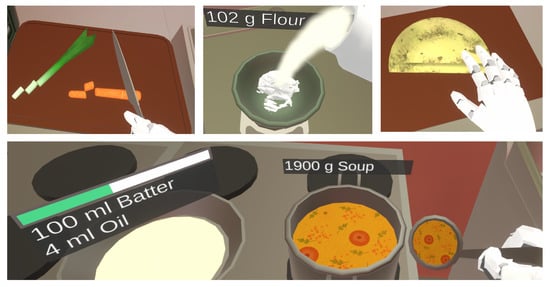 Cook: The second scenario takes place in a kitchen scene where users have to perform simple cooking tasks: cutting vegetables, weighing ingredients, and preparing dishes. Figure 6 shows the scenario environment that includes two stoves, a sink, a kitchen counter, utensils, and ingredients. Similarly to the electrician scene, the gameplay starts with an introduction to the different utensils used during the tasks by sorting them in the scene. Users should gain basic skills to handle similar cooking tasks in real-life scenarios within time constraints. In the scenario, users are asked to prepare two dishes for a certain number of guests within a given time frame. The first dish requires the user to cook and serve a soup in a bowl. For the second dish, the user has to mix a pancake batter, cook a pancake in a pan, and serve it with jam on a plate. The guide provides step-by-step instructions and recipes, assisting users throughout the whole cooking procedure. The user’s task is to accurately prepare the right ingredients in the correct amounts, where some ingredients have to be cut and others weighed using a kitchen scale and then mixed. For cutting ingredients, we used the Unity OpenFracture (https://github.com/dgreenheck/OpenFracture (accessed on 1 July 2024)) package, allowing realistic mesh slicing. Figure 7 illustrates the various interactions within the kitchen scene, showcasing activities such as cutting vegetables, weighing flour, and rolling pancakes. The scenario also includes a progress indicator to show if the food is being prepared correctly and features the possibility of burning food if not cooked properly. These interactive elements are designed to provide an immersive and educational experience, helping players develop practical cooking skills that can be applied in real-life situations.