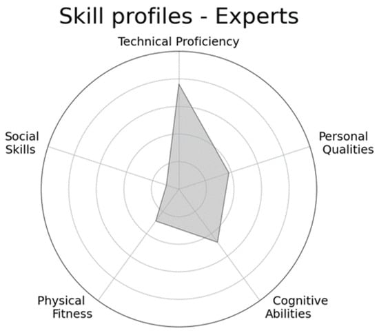 When asking the job coaches about the tasks of an electrician, they mentioned installing, repairing, and maintaining electrical systems, circuits, and cables. This included power sockets, doorbells, and lightning conductors, which align with the descriptions given by the electricians. In addition to installation and maintenance, the electricians described tasks such as laying cables, connecting circuit boards, troubleshooting, pulling cables, and testing electrical components. They highlighted skills such as interest, attention, concentration, and willingness to learn. The coaches pointed out that technical and mathematical understanding, good hand–eye coordination, logical thinking and problem-solving skills, and the ability to read plans are important for the job. To visualize the skill profile, we used a radar chart generated using the Python library matplotlib. (https://matplotlib.org/ (accessed on 15 August 2024)). Figure 8 shows the recommended skills profile of an electrician according to the experts’ answers, which have been normalized and categorized into five categories: technical proficiency, personal qualities, cognitive abilities, physical fitness, and social skills. The job prospects for electricians were described as attractive with many job offers. The job coaches underlined the demand for electricians due to ongoing digitization and new forms of technology and multimedia. They described the job prospects as “very good” and “promising” and noted many open positions in this field, resulting in a relatively good employment situation for electricians. The electricians themselves agreed with this statement, referring to the increased use of electricity in all areas. They saw their job as a “profession with a bright future”. Electricians rated their career prospects as “very good”, reflecting the rising need for qualified professionals to support growing infrastructure and technical progress. In addition, both coaches and electricians underlined that the job is equally suitable for boys and girls to learn. The job coaches emphasized that the most important factors for success in this field are interest in the profession and motivation. They conceded that there are currently more males in this field, but they highlighted that the job does not have gender-specific requirements. Electricians conceded that there are still educational barriers that can affect girls’ participation in this field. Despite these barriers, there was a consensus that the profession is inclusive and offers opportunities for all, regardless of gender. The average monthly salary for an electrician was reported as 2300 EUR after deductions.