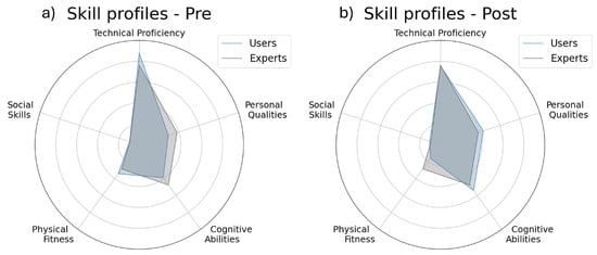 Most frequently mentioned skills that an electrician needs according to the experts compared against the users’ responses (a) before and (b) after playing the VR application.