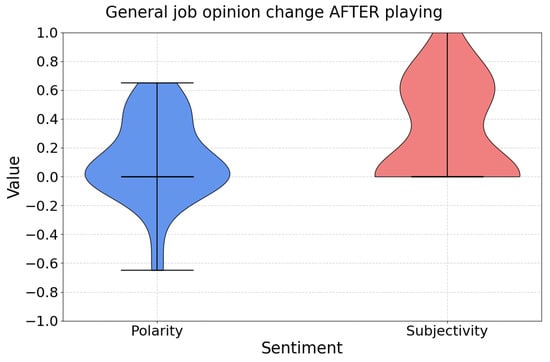 Job Outlook Expectations: Initially, there was a broadly positive perception of good job prospects and ease of finding work as an electrician. Participants highlighted the constant demand and the numerous opportunities through apprenticeships. After the job experience, there was a shift in responses. While some still saw good prospects and acknowledged the ongoing need for electricians, there was more caution and uncertainty expressed. Some noted challenges and a decrease in personal enthusiasm for pursuing a career as an electrician, indicating a more nuanced view after considering both the positives and potential difficulties of the job. To examine participants’ opinions about job outlook expectations and any changes in their general job opinions after playing VRChances, we performed a sentiment analysis, including polarity and subjectivity scores using the Python library TextBlob (https://textblob.readthedocs.io/ (accessed on 15 August 2024)). Figure 11 illustrates the user sentiment on their job outlook expectations before engaging with the application. The polarity score indicates the positivity or negativity of the feelings, while the subjectivity score measures the degree of personal opinion versus objective information. Initially, most adolescents perceived a promising future for the electrician job, with a median polarity score of 0.2, indicating a slightly positive sentiment. Afterward, many teenagers stated that their career outlook did not change, which resulted in the polarity score leaning towards zero, indicating a more neutral sentiment. The graphic representation of the sentiment analysis of the job outlook after the VR session can be seen in Figure 12. The sentiment analysis of the job opinion change after playing VRChances is presented in Figure 13. The results show a median polarity score of 0.0, indicating a neutral sentiment. The values range from −0.65 to 0.65, with a higher distribution for positive values. Similarly, the median subjectivity score is 0.0, suggesting mostly objective responses.