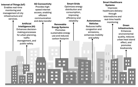The strategic implementation of advanced technologies aims to improve the quality of life for connected citizens and foster sustainable urban environments that are resilient and adaptable [8]. Sustainability is central to future urban development, emphasizing environmental, social, and economic strategies to create resilient and livable cities. Key concepts include the circular economy for waste reduction, resilience against challenges like climate change, sustainable mobility through eco-friendly transportation, and smart governance using data-driven decision making to enhance transparency and resource management [9,10,11].