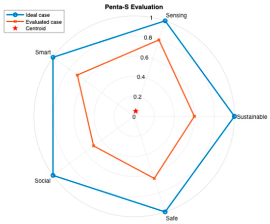 The Pentagon (or Penta-S) Framework takes a phased approach, from individual to city-level needs, focusing on solutions that improve daily life. Figure 2 depicts a pentagon to evaluate and balance each aspect when assessing smart city products or systems. The blue pentagon represents the ideal scenario where all the “S” features are fully achieved. In contrast, the orange polygon depicts the actual performance of the case study, where not all “S” features are met.