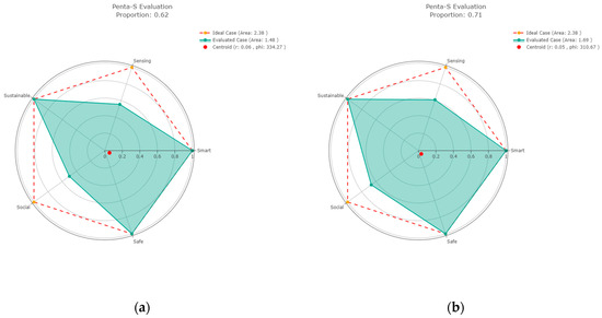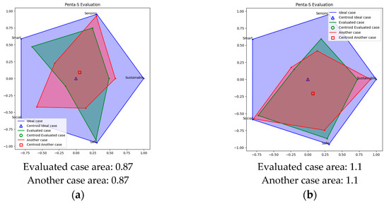 A pentagon can maintain the same centroid and evaluated area while varying its S-dimensions. Figure 3a shows how the green (evaluated) and red polygons share a centroid but differ in features, with the safe feature higher in the green polygon and the sensing feature greater in the red one. Figure 3b illustrates that the green polygon has a higher sensing value, while the red one excels in sustainable, smart, and social features, highlighting that S-dimensions can vary even with the same centroid. Maintaining a consistent centroid reflects a fixed cost, allowing different feature profiles based on priorities. A shift in centroid indicates changes in price or resource allocation.