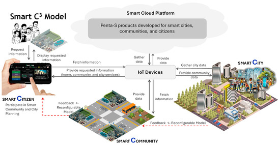 The Pentagon Framework centers on citizens in city design, employing real-time data from IoT devices, apps, and sensors to enhance city management. This citizen-centric model facilitates real-time service adjustments, fostering engagement and supporting sustainable urban growth [40]. IGI Global defines a smart citizen as one who utilizes technology to engage with the smart city, tackle local challenges, and participate in decision-making processes [41]. In this context, smart citizens connect their homes to the wider community and city through various devices. Li et al. [42] characterize a smart community as a network of smart homes, amenities, and green spaces that enable social interaction among residents interconnected through technologies like powerline communication, Bluetooth, Wi-Fi, phone lines, and Ethernet. Also, the Smart C3 model, introduced by Ponce et al. [40], consists of a three-layer structure: