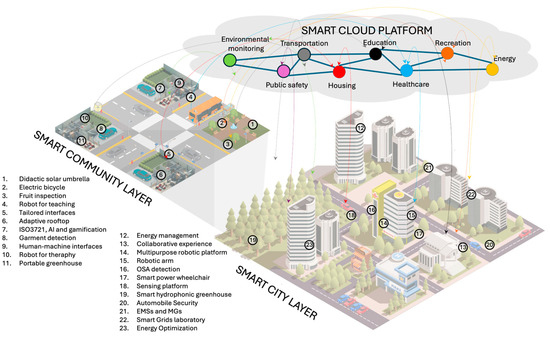 For instance, Silva et al. highlight energy management and green infrastructure [12] while providing a roadmap for integrating sustainable practices into urban planning. Sancino et al. focus on the role of visionary leadership and collaboration with smart city governance through public-private partnerships [13]. Also, Xu et al. explore smart cities as self-organizing systems that integrate physical, social, and digital dimensions, stressing the importance of governance and interdisciplinary approaches to address societal challenges, emphasizing the need for multidisciplinary integration and addressing societal challenges [14]. Kitika et al. explore how people in Chiang Mai, Thailand, engage with smart activities, proposing two categories for redefining a smart city: “Smart community”, a network of converging lifestyles, and “Smart district”, areas with high-speed internet and social participation [15]. Furthermore, a Smart Territory initiative in Chihuahua, Mexico, showcases the integration of technology and entrepreneurship for urban development [16].