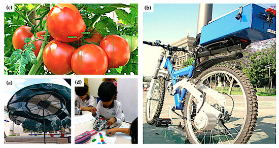 Figure 8. Developed solutions: (a) Solar umbrella for didactic purposes. (b) Bicycle with solar and regenerative charge modules. (c) Lego robot for teaching math at elementary school level. (d) Tomatoes’ recognition by using artificial vision for quality inspection.- Social: Encourages renewable energy, community engagement, and hands-on solar learning.