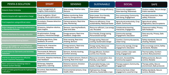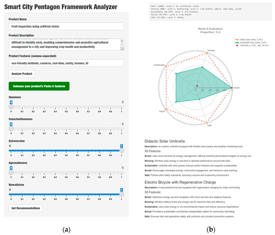 Recent developments in various fields have shown a clear trend towards incorporating “S” features—such as sensing, smart, and sustainable technologies—in agrifood products [28]. Additionally, the design of robots integrates sensing, smart, sustainable, and social attributes. Furthermore, 3D food printers have evolved into sensing, smart, sustainable, social, and safe technologies [29]. The overarching goal of creating solutions that prioritize end-users’ needs, particularly within the context of smart cities, drives these advancements. A balanced approach is imperative in smart city development, requiring consideration of technological, environmental, and social aspects to create holistic urban solutions. This paper introduces the Pentagon Framework, a web application and a compliance feedback API, which includes five essential features: smart, sensing, sustainable, social, and safe design. This framework is designed to evaluate products holistically, supporting early stage evaluations and continuous improvement, ensuring that products can adapt over time to achieve sustainability goals. Additionally, the Pentagon Framework integrates personality traits through a matching algorithm, allowing solutions tailored to individual preferences, which increases user engagement and satisfaction.