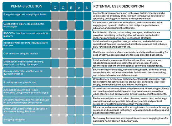 Incorporating social features in the use phase of Penta-S products enhances user experience and effectiveness. Ensuring accessibility fosters a user-centric and equitable smart city environment while tailoring products to citizens’ needs improves quality of life. Personalization, guided by the OCEAN model (“Big Five”) of personality traits [43]—openness (exploration), conscientiousness (organization), extraversion (sociability), agreeableness (empathy), and neuroticism (emotional sensitivity)—further refines this approach.