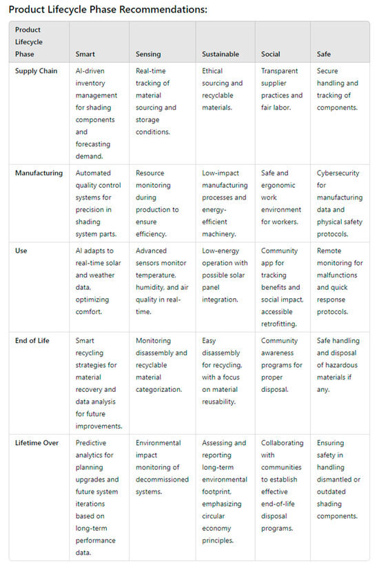 Figure 6b categorizes the life cycle phases of smart city technologies, highlighting critical stages in integrating Penta-S products. Each phase focuses on sustainability and efficiency, with recommended activities outlined to ensure these goals: