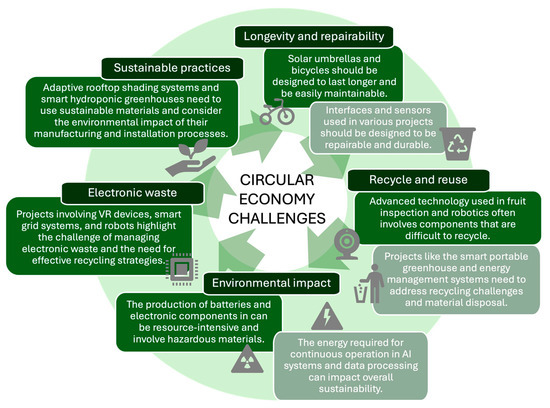 - Sustainability and environmental impact. The sustainable dimension aligns with frameworks like CITYkeys, promoting energy efficiency and renewable solutions [56]. However, trade-offs between innovation and environmental impact, such as e-waste from IoT devices, must be addressed. For instance, producing and maintaining sensors and IoT devices could increase electronic waste and energy consumption. Incorporating circular economy principles in designing and deploying technologies would ensure environmental benefits outweigh potential negatives. Figure 17 illustrates challenges like sourcing recyclable materials, advanced electronics, and rare materials. The focus areas for improvement are product longevity, recycling, reducing hazardous materials, and resource efficiency.