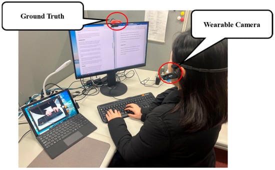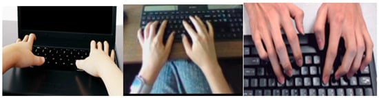 A total of eleven students from our graduate university participated in the data collection phase, including four females aged between 25 and 31 (seven males and four females in total, with an average age of M = 28), and they all possessed fluent typing skills. The participants were instructed to use a wearable camera while typing on a computer. The 4K high-definition camera worn on the ear captured images of the “obscured typing hands”, as shown in Figure 3.