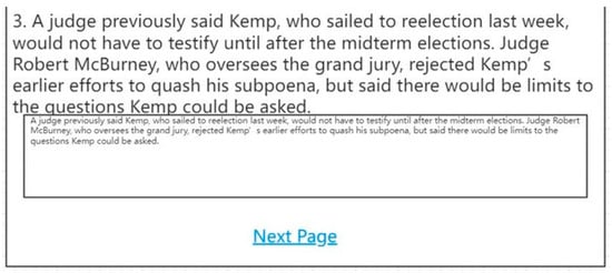 We downloaded CNN news from CNN/Daily Mail (https://github.com/abisee/cnn-dailymail, accessed on 17 December 2024) and split the news into sentences of varying lengths. Participants were required to input paragraphs of varying lengths using the QWERTY keyboard based on prompts. The UI is shown in Figure 4. We developed a small program to monitor the participants’ keypress states, recording the time of keypress events. After the experiment, participants uploaded video footage from a wearable camera. We automatically extracted images before and after each keypress event using the recorded keypress times. This approach helps avoid entering invalid content into the database, such as distraction, rest, or contemplation moments.