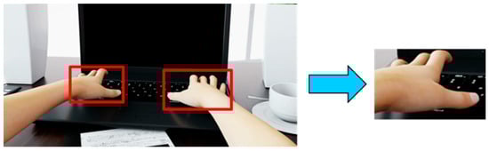 After the experiment, human annotators manually annotated the bounding boxes using Media Pipe [] as an assistive tool. Through this process, we extracted applicable portions of images featuring the typing hand from the wide-angle wearable camera, as shown in Figure 5.