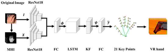To address these research questions, we propose utilizing the back of the hand image. By extracting information from the back of the hand image, we can accurately predict the finger’s position even when it is obstructed. To achieve this, we first establish a database of back of the hand images. Subsequently, we input the back of the hand images and corresponding motion history images (MHI) into a two-stream long short-term memory (LSTM) network. This network processes the information and applies Kalman filtering (KF) to reduce jitter, thereby enhancing the precision of hand position tracking. The reason for using LSTM instead of other models is based on Section 4, which evaluates multiple models using key evaluation criteria such as latency, accuracy, and jitter. Advanced models such as TSSequencer [], PatchTST [], BNNActionNet [], and LSTM are applied to comprehensively compare each model’s suitability for VR typing tasks. Based on this thorough evaluation, including factors such as latency, accuracy, jitter, and ease of deployment on head-mounted displays (HMDs), we ultimately decided to adopt 2S-LSTM-KF as the optimal model for our VR typing system.