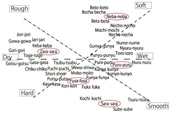 Onomatopoeia map [11]: The red circles show the onomatopoeia selected for the experiment. “Neba-neba” (sticky), “zara-zara” (rough), “fusa-fusa” (fluffy), “puru-puru” (jiggly), and “sara-sara” (smooth/sandy) were chosen, because they represent distinct points near the ends of the respective axes on the map.