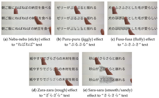 Our experimental results show the following: For the “neba-neba” onomatopoeia, the associated “neba-neba” effect produced a statistically significant difference compared to no effect in the evaluation of both hard–soft and slippery–sticky qualities. For the “puru-puru” onomatopoeia, the associated “puru-puru” effect produced a statistically significant difference compared to no effect in the evaluation of both hard–soft and elastic–inelastic qualities. For the “fusa-fusa” onomatopoeia, the associated “fusa-fusa” effect produced a statistically significant difference compared to no effect in the evaluation of the hard–soft quality. These findings confirm that the “neba-neba,” “puru-puru,” and “fusa-fusa” effects create a pseudo-haptic feeling for their respective associated texts, specifically across the adjective pairs of hard–soft, slippery–sticky, and elastic–inelastic. Notably, for hard–soft, our proposed effects commonly yielded a significant impact.