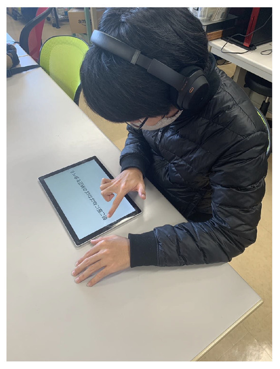 In this experiment, participants were asked to trace-read sentences displayed on a tablet, with each character measuring 1.5 cm × 1.5 cm, at a speed of approximately 10 cm/s. To prevent participants from tracing without interpreting the meaning and to standardize the time required for meaning interpretation, audio readings of the sentences were created using VOICEPEAK version 1.0.1 (AHS Co., Ltd. (Tokyo, Japan)), and participants were instructed to trace along with the audio.