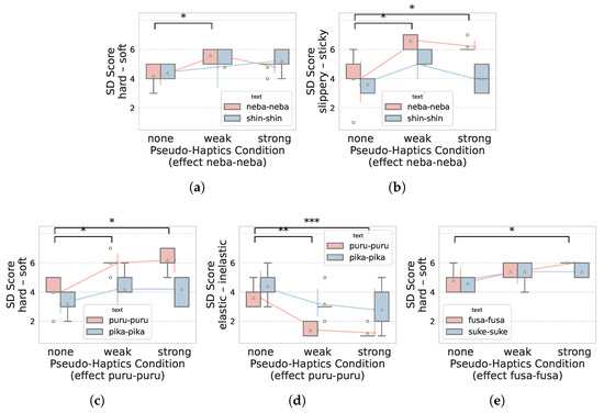 Next, we compared these three effects with results from sentences that did not have a symbolic semantics related to the pseudo-haptic effect (e.g., a “neba-neba” pseudo-haptic effect applied to a sentence that did not contain an onomatopoeia of “neba-neba”). The results are shown below figures (Figure 4a–e). As shown in each figure, there are statistically significant differences between no effect and weak/strong effects in related texts (for example, an onomatopoeia of “neba-neba” with a “neba-neba” pseudo-haptic effect). However, there are no statistically significant differences in unrelated texts (for example, an onomatopoeia of “shin-shin” with a “neba-neba” pseudo-haptic effect).
