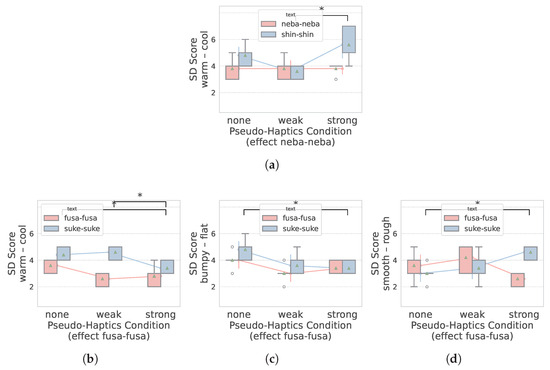 On the other hand, we examined other effects, “zara-zara” and “sara-sara,” which show no statistically significant difference when compared to the no effect condition in related texts. The results are shown in the figures below (Figure 5a–d). As shown in each figure, there are statistically significant differences between a strong-effect condition and the others in unrelated texts (for example, an onomatopoeia of “shin-shin” with a “neba-neba” pseudo-haptic effect). However, there are no statistically significant differences in related texts (for example, an onomatopoeia of “neba-neba” with a “neba-neba” pseudo-haptic effect).