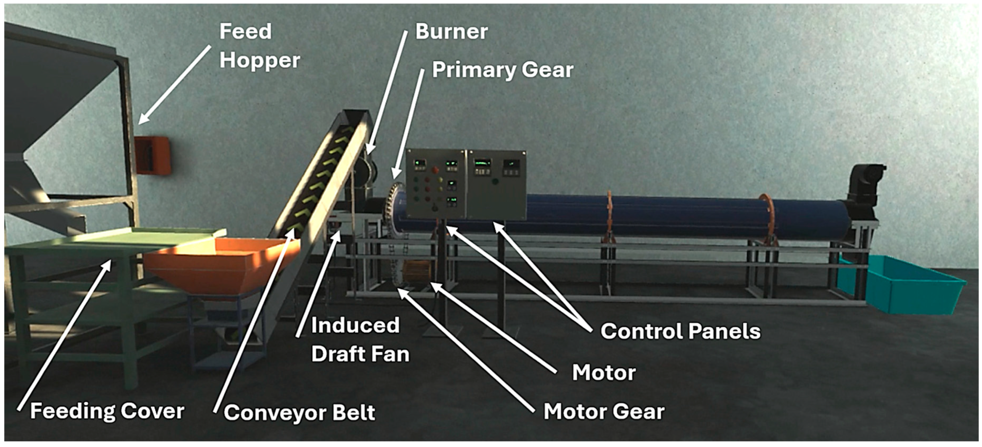 2.1. Visual Aspects of the Digital Rotary Dryer in the VR Environment