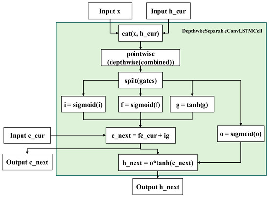 As shown in Figure 2, the DSC-LSTM module combines the Depthwise Separable Convolution and LSTM neural network units for efficiently processing multimodal spatiotemporal sequence data. By replacing the full convolution operation of traditional ConvLSTM with a 3 × 3 spatial convolution per channel and a 1 × 1 pointwise convolution, the number of parameters is significantly reduced while retaining the gating mechanisms of LSTM to dynamically learn spatiotemporal features and control state updates, ultimately outputting new hidden states h_next and cell states c_next.
