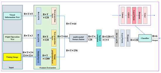 The M3D-Net architecture of the model proposed in this paper utilizes a multimodal deep learning model framework, as shown in Figure 3, to complete classification tasks by fusing image and text features. It mainly consists of three branches. The first branch processes visual information, text data, and the second branch processes flight operation text data. Both use Bi-LSTM to extract features and further project and reduce dimensions. The third branch processes image data using MobileNet-V3 to extract image features and reduces dimensions through a projection layer. Subsequently, the cross-modal attention mechanism aligns and fuses image and text features to generate a shared spatiotemporal feature representation. Then, the DSC-LSTM module models temporal information and dynamically captures the contextual dependencies in the sequence. Finally, the category prediction is output through a fully connected classification head. This model improves training stability and generalization ability through techniques such as freezing some image network parameters, regularization, and gated forget bias initialization, and is suitable for tasks requiring multimodal collaborative modeling.