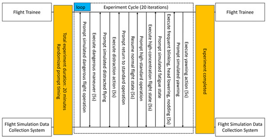 During the simulated five-sided flight experiment, randomly generated task prompts occur at non-predictable intervals, mandating flight cadets to complete corresponding simulated task experiments upon prompt presentation. As depicted in Figure 4, the experimental timeline diagram delineates six distinct attention state detection task categories. Upon task prompt appearance, the simulation software automatically suspends operations; subsequent prompt disappearance triggers system resumption, enabling flight cadets to perform designated flight training scenarios. The data acquisition system concurrently captures facial images, visual parameters, and flight metrics in real-time while applying task-specific labels to each dataset. Figure 5 outlines the complete experimental protocol schematic. A single experimental session attains completion status only following full execution of a five-sided flight simulation cycle. The experimental time of each group was about 20 min.