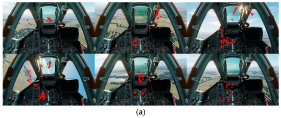 Figure 6a,b show the gaze point distribution and gaze path characteristics under six flight flying states. In the first row, the first picture shows a significant deviation of the flight cadet’s gaze from the task during a dangerous flight, with scattered points and a messy path. The second picture indicates distracted flight, with gaze fixed on irrelevant areas and a lacking dynamic path. The third picture represents normal flight, with evenly distributed gaze points covering key areas. In the second row, the first picture shows a concentrated gaze on relevant areas during highly concentrated flight, with short and frequent path switching. The second picture shows abnormal gaze distribution and a discontinuous path during fatigue flight, along with eye closure or wandering. The third picture shows reduced and sparse gaze points and a broken path during yawning, verifying the negative impact of fatigue. Gaze patterns under different states can be distinguished by features like distribution, regularity, and coverage.