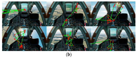 Gaze diagrams under different attention states. (a) Gaze point (Red dot) diagrams under six different flight flying states. (b) Gaze path (Green line) diagrams under six different flight flying states.