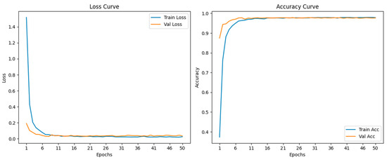 The training results of the M3D-Net architecture are shown in Figure 8. The loss and accuracy curves of training and validation demonstrate the dynamic process of model training. The left figure is the loss curve graph of training and validation, and the right figure is the accuracy curve graph of training and validation. From the initial Epochs 1–6, it can be seen that the model learns the data features rapidly; during the middle period from Epochs 6–16, the decline slope slows down, entering the fine-tuning stage. In the later period after Epoch 16, it stabilizes below 0.1, indicating that the model has converged.