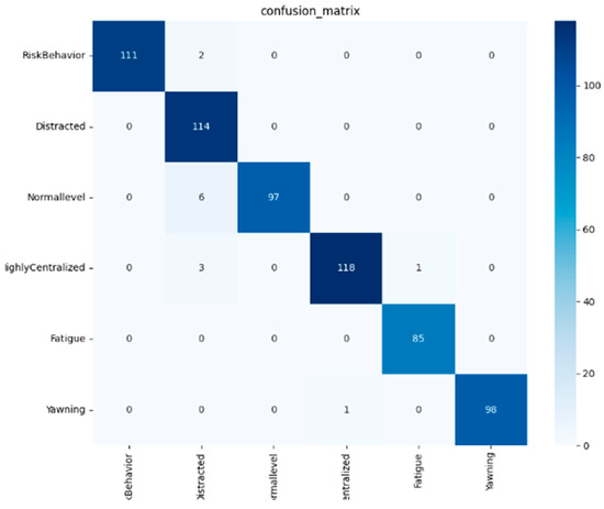 The confusion matrix diagram is shown in Figure 9, clearly demonstrating the performance of the six-class behavior recognition model. The model identifies “Distracted” and “Highly Centralized” relatively accurately, while there are 6 cases where “Normal level” is misjudged as “Distracted”. It is particularly noteworthy that for all categories, the values on the main diagonal, i.e., the correctly predicted values, are significantly higher than those on the non-diagonal. Among them, “RiskBehavior” and “Yawning” maintain a high accuracy rate, with only 2 and 1 minor misjudgments, respectively. The visualization of the confusion matrix intuitively shows that the sample size of “HighlyCentralized” in the dataset is the largest, while that of “Fatigue” is relatively small. Overall, it indicates that the model has reliable classification capabilities.