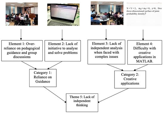 Creative and independent thinking is essential in mathematics, as many topics require its application in real-world problem-solving scenarios. A lack of this ability can reflect a less supportive learning environment, particularly in the case of international students. When problems are presented with altered forms or variables, students who lack creative problem-solving skills often struggle to find solutions. This difficulty not only slows their progress but also leads to disengagement and a loss of interest in the class. These themes emerged from (1) reliance on guidance and (2) creative applications. The mapping of these themes and their elements is illustrated in Figure 5.
