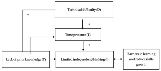 The Learning Barriers Model (Figure 11) illustrates how several obstacles interact to affect learning outcomes. These key factors include Lack of Prior Knowledge (P), Time Pressure (T), Technical Difficulties (D), and Limited Independent Thinking (I). The model uses symbols to represent the relationships between these elements.