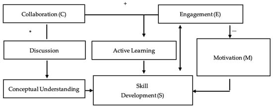 The MATLAB Technology Learning Interaction Model (Figure 12) shows the cyclical relationships between Collaboration (C), Engagement (E), Motivation (M), and Skill Development (S) with elements, namely discussion, active learning, and conceptual understanding. Symbolic relationships (e.g., C + E, E → M, M → S) are paired with narrative explanations to ensure comprehension of the model.