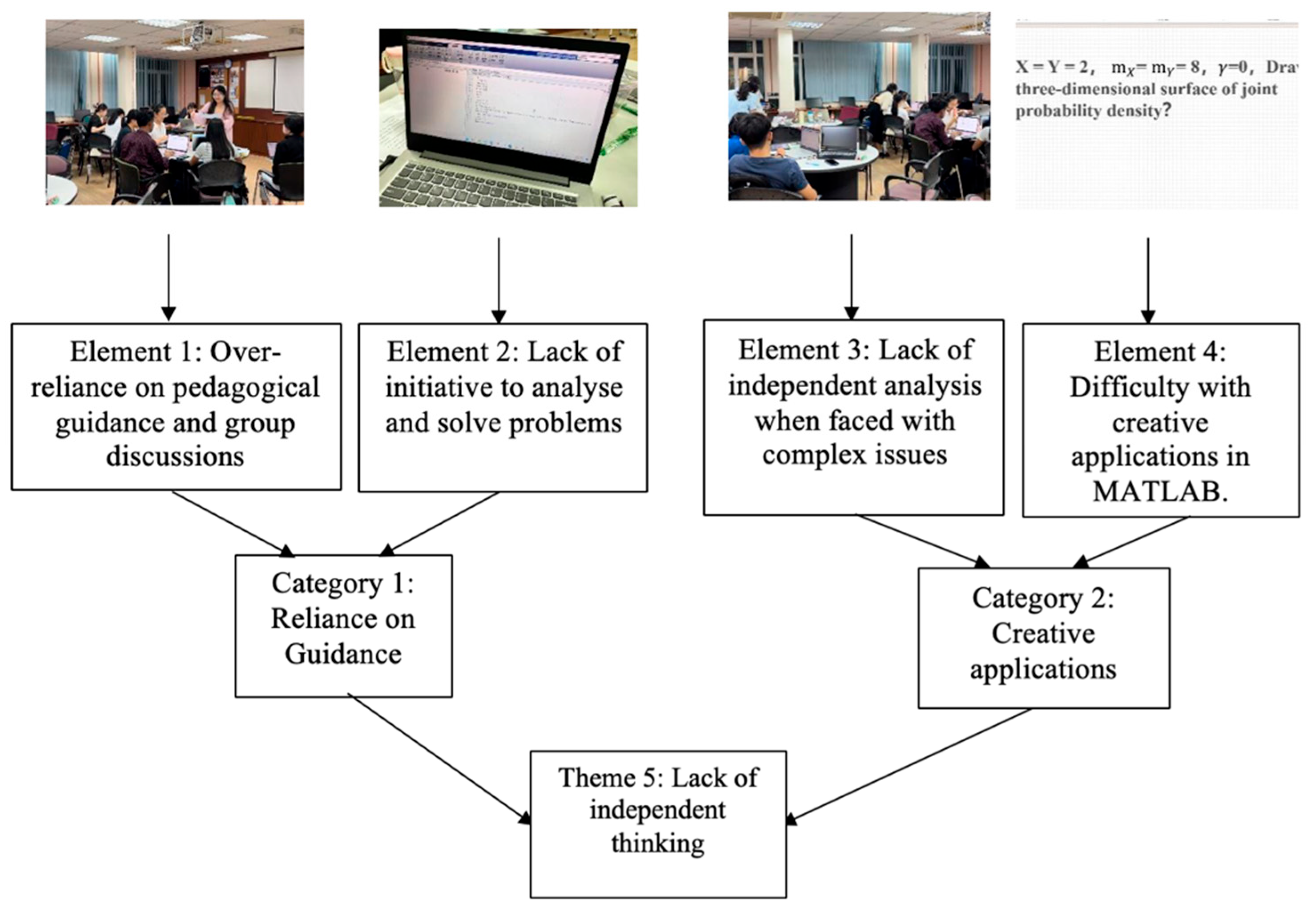 Creative and independent thinking is essential in mathematics, as many topics require its application in real-world problem-solving scenarios. A lack of this ability can reflect a less supportive learning environment, particularly in the case of international students. When problems are presented with altered forms or variables, students who lack creative problem-solving skills often struggle to find solutions. This difficulty not only slows their progress but also leads to disengagement and a loss of interest in the class. These themes emerged from (1) reliance on guidance and (2) creative applications. The mapping of these themes and their elements is illustrated in