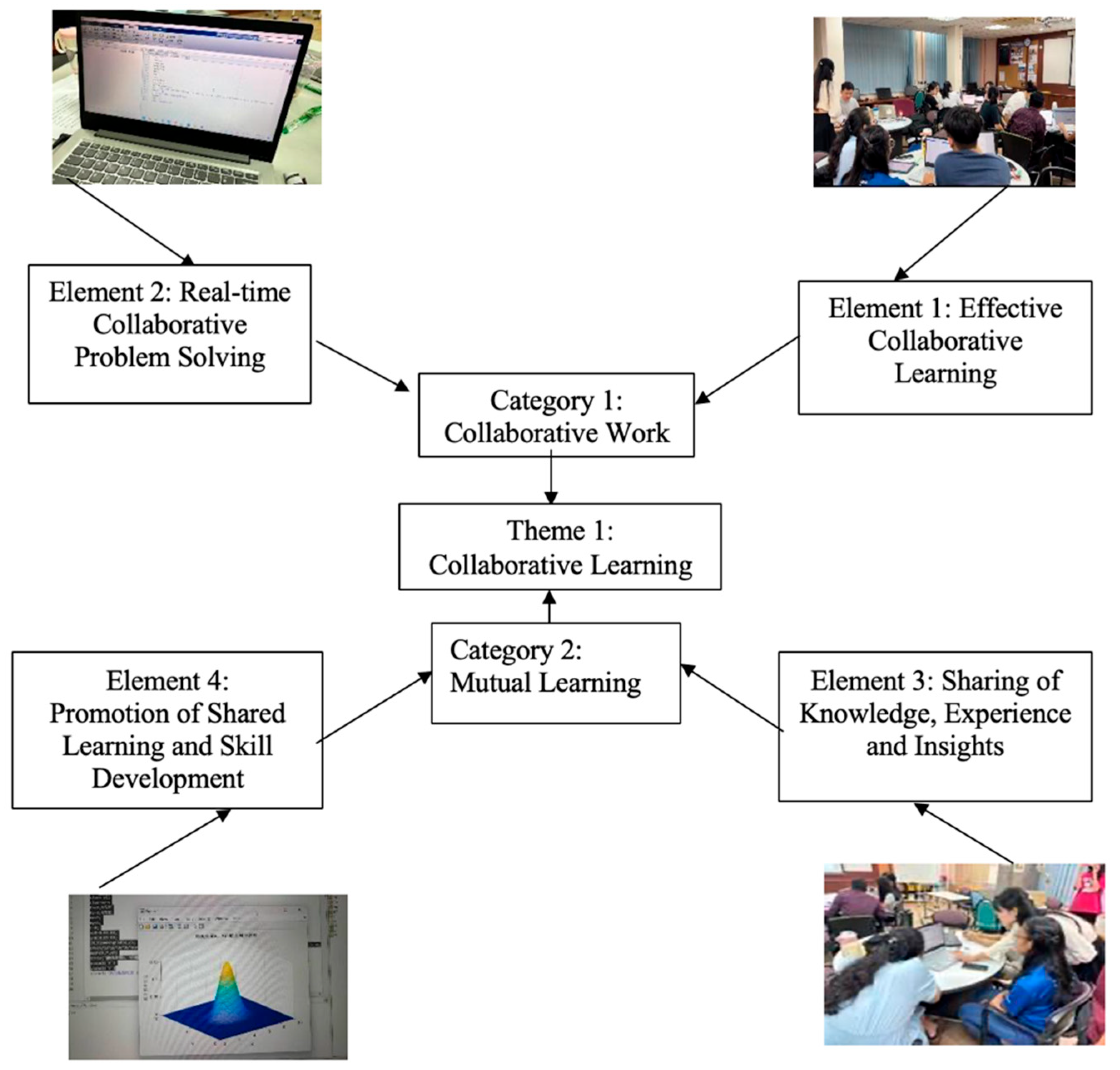 Based on the classroom observation and interviews, it was found that MATLAB offered students a platform for group collaboration that enhances teamwork skills through joint participation in writing MATLAB code, solving problems, and analysing data. This collective effort not only positively impacted learning outcomes but also promoted the sharing of information and created a supportive learning atmosphere. The collaborative learning theme comprises two main categories of elements: (1) Collaborative Work, which is observed through interactions that demonstrate effective teamwork and real-time problem-solving, and (2) Mutual Learning, identified when students actively share their acquired skills and knowledge, as well as their experiences and insights, leading to a sense of satisfaction.