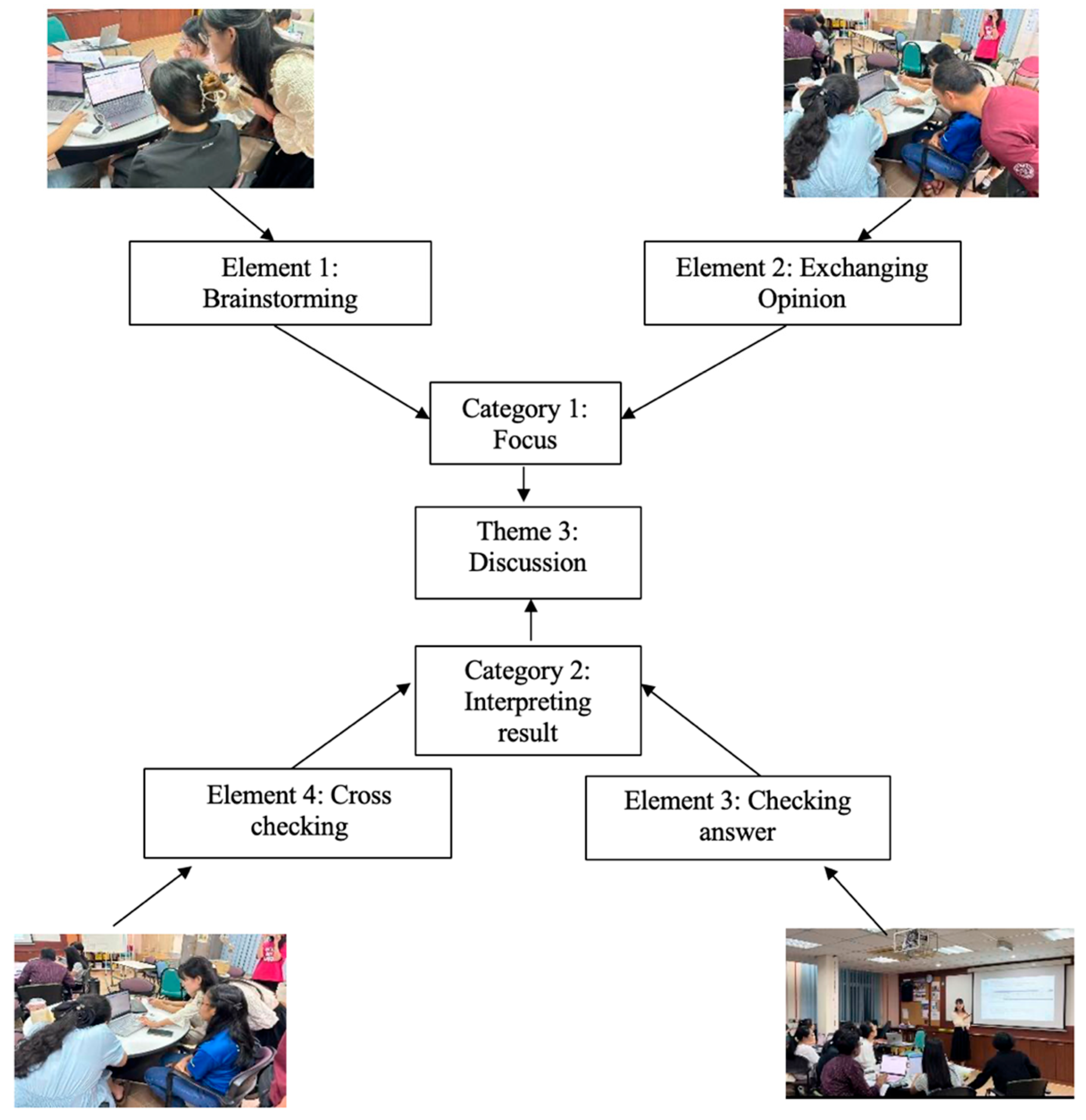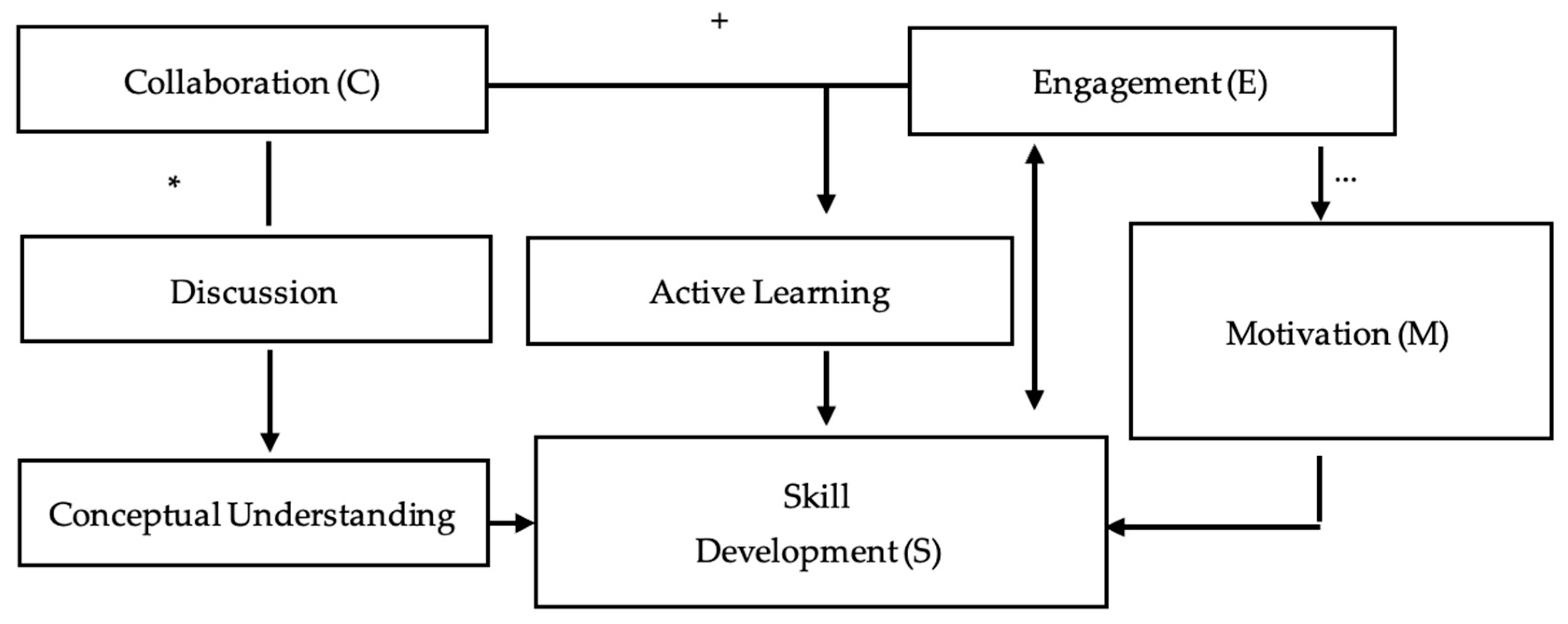 Figure 12) shows the cyclical relationships between Collaboration (C), Engagement (E), Motivation (M), and Skill Development (S) with elements, namely discussion, active learning, and conceptual understanding. Symbolic relationships (e.g., C + E, E → M, M → S) are paired with narrative explanations to ensure comprehension of the model.