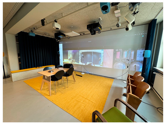 Immersive Projection Environment. The visual centrepiece, a wall-filling double projection measuring 6.25 m × 2.80 m, transforms an entire wall into a dynamic communication surface (Figure 4). This not only allows presentation content to be displayed but also creates a visual communication space in which remote participants can appear life-size. The ultra-short-throw technology allows instructors and students to move freely in front of the projection surface without casting distracting shadows, a key advantage for interactive teaching scenarios. The life-size, wall-filling display should support social presence. Seamless soft-edge blending allows the technical construction to fade into the background and may support immersion in virtual worlds, whether for 360°-based virtual field trips [43] or viewing large-format visualizations as a group. The projection represents the fourth wall of the room, which can be transparent for digital worlds or opaque for local activities as required.