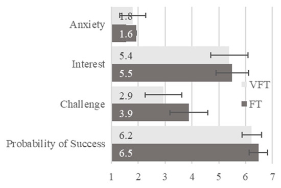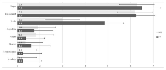 Emotion. The results (Figure 2) may generally be considered conducive to learning. Positive emotions, such as Hope and Joy, scored high, i.e., above 6 points. In contrast, negative emotions, such as Boredom, Irritation, Shame, Hopelessness, or Nervousness, scored below 2 points and are therefore rated as very low. Pride occupies a middle position. For the FT, a score of 4.9 is regarded positive, while for the VTF, the score is 3.0, which is two points lower and in the lower half of the scale, thus rather low. This divergence is striking. It could reflect the lower level of challenge in the VFT. Alternatively, the higher level of pride in the FT might stem from the individual organizational effort required to arrive on time.