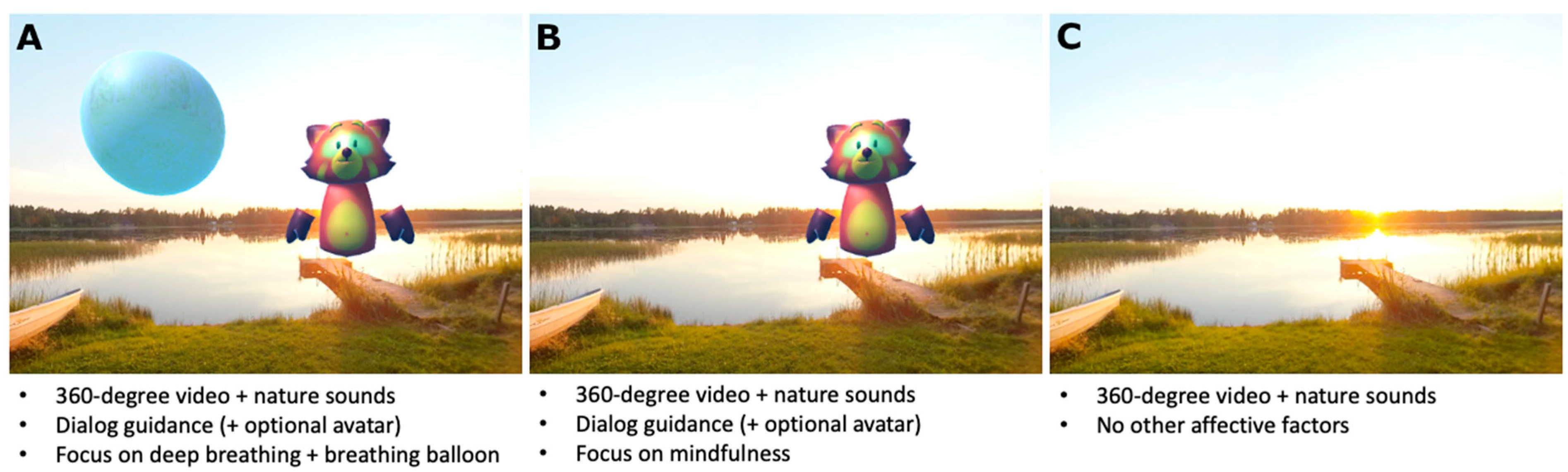 - Jyskä, I.; Turunen, M.; Puura, K.; Chaychi Maleki, A.; Karppa, E.; Palmu, S.; Viik, J.; Mäkelä, J. Mindfulness-Based Guided Relaxation Exercises in a Virtual Natural Environment to Reduce Periprocedural Pain and Anxiety in Pediatrics. Virtual Real. 2024; under review. [Google Scholar]