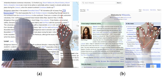 (a) Modal key-stroke combines pointing with the index and clicking with a key press. (b) A pinch interaction to click web elements.