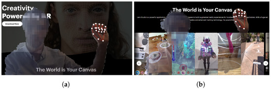 Pointing and clicking is also a relevant interaction paradigm for systems that leverage mid-air interactions [16]. Free-hand gestures have been mainly used to control displays by pointing at them, and techniques mainly involve raycasting [17,18], gaze+pinch [19], or more relative pointing techniques [16] to support selection. We explore a different interaction style; the user does not raycast but aligns the image they see of their own index finger (pointer) overlaid on top of graphical elements (e.g., button, sliders) in a webpage. This is different from most research, which has focused on distant displays. Thanks to webcams, a low-cost 2D and 3D device to support user interaction, mid-air interactions, and free-hand gestures can be used for pointing, using image-based hand tracking [20]. Modern machine learning techniques allow for even more precise and reliable pointing and more elaborate gesture interactions [21]. Most research in this area demonstrates how image-based hand tracking with a webcam can be used as 3D input, e.g., that of Chunduru et al. [22], who also used MediaPipe’s hand tracking to enable 3D interaction with a globe.
