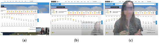 WebPresenter can be used as a presentation tool for casual broadcasters. Content creators use platforms like YouTube, Twitch, or TikTok to broadcast, very often in casual ways, their content. In this use case, we demonstrate how WebPresenter can be used as a powerful tool to create even more engaging experiences for content creators, for example, a casual weather forecast report (Figure 6c); a broadcaster navigates to a national weather website and uses the visuals and temperature curves in their interactive background to create a similar, but augmented, experience of a weather forecast report. In a related context, WebPresenter can be used on top of one or many news websites too, and be used as a minimal editorial report presentation support. WebPresenter can also be used by influencers to present their content, e.g., a broadcaster can use their Instagram page to showcase their cave diving activities and share their content with the community.