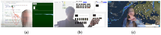 Education institutions often rely on the flipped classroom model, in which students access learning material before a contact lecture time. Very often, this content involves a lecturer teaching programming concepts in a video. In this use case, WebPresenter is used to teach a functional reactive programming technique in TypeScript as part of a fairly advanced Programming Paradigms unit. The code implements a streaming card counting algorithm (Figure 6a). The code is demonstrated and explored in a web-based integrated development environment (IDE) (https://stackblitz.com (accessed on 17 January 2025)) with a variety of interactions, usually available via mouse or touch interaction, which are replaced with video gestures.