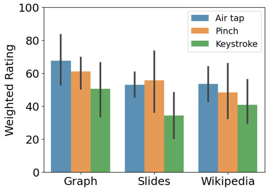 The overall Task Load Index of using WebPresenter had an average weighted rating (https://measuringu.com/nasa-tlx/ (accessed on 17 January 2025)) of across all contents and clicking modalities. Compared to the typical keyboard-and-mouse combination, the load index associated with the use of WebPresenter was considered somewhat high (between 30 and 49) to high (between 50 and 79) compared to previously established thresholds [39]. Differences between clicking modalities or contents can be visualized in Figure 7 for exploratory purpose. Among the six dimensions of the NASA-TLX, we observed that physical demand was globally higher for the modal keystroke and air tap than for the pinch. To explain this effect, P4 reported the need to coordinate for the modal keystroke, and P5 verbalized strong muscle tension to keep the arm high and the finger still. However, the modal keystroke generated less frustration than the other modalities because of the higher sense of control that it provides. While these results have been known for decades [40], and mid-air gestures are known to induce the Heisenberg effect on point selection with free-hand selection [15], it is still notable that the users were able to perform relatively uninterrupted presentations of good quality in all modes of interaction.